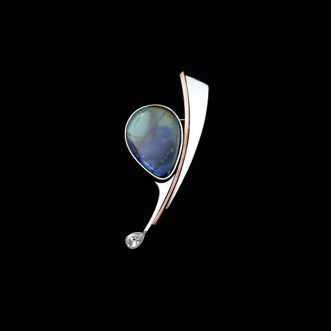 Birgitte Buchhave Munch. Broche i sterling sølv med spectrolit og 14k guld og topaz.
