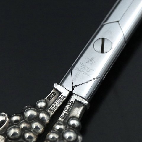 Carl M. Cohr. Druesaks i sterlingsølv. Handtag i sterling sølv. blade i stål. Tegnet of udført hos Carl M. Cohr - Fredericia 1893 - 1937. Stemplet med Cohr, Denmark, Sterling. L. 13 ,8 cm. Vægt 59,4 Brugt i god stand.