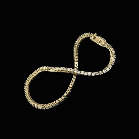 Tennisarmbånd i 18k guld med brillanter. 77 brillanter på hver 0.03 ct. Samlet 2,30ct. Stemplet 750 L. 17,3 cm. B. 2x3 mm. Vægt 9,8 g. Brugt i god stand.