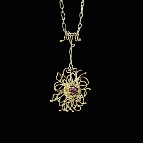 Bent Exner (1932-2006). Halssmykke i 14k guld med ametyst. Tegnet og udført af Bent Exner (1932-2006) Stemplet 585. Vedhæng 6,5 x 4 cm. Kæde L. 66 cm. Vægt 17,8 g. Brugt i god stand.