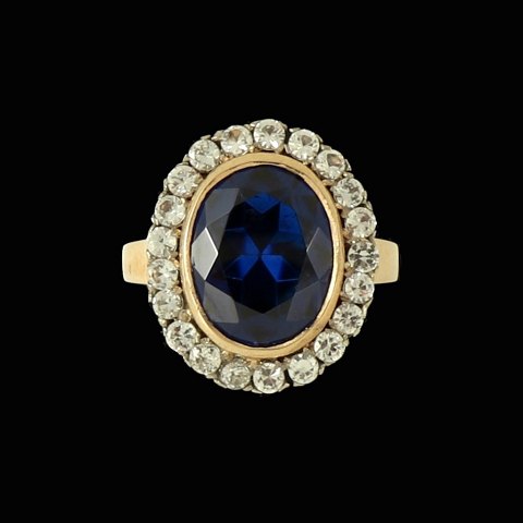 Cocktailring i 18k guld med syntetisk safir og 21 diamanter. Total 0.63ct. Stemplet K18. Str. 54 mm. Safir 1,2 x 0,9 cm. Vægt 6,2 g. Brugt i god stand.