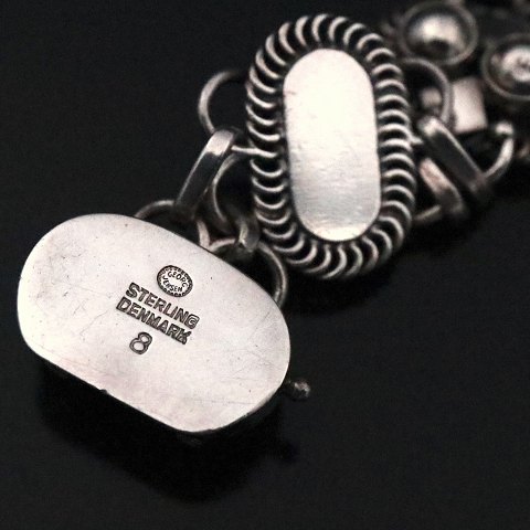 Georg Jensen. Armbånd i sterling sølv #8. Tegnet af Georg Jensen 1866 - 1935. Stemplet med post-1945 GJ Stempler. L. 18,2 cm. Bredde 1,7 cm. Vægt 28,2 g. Brugt i god stand. Leveres i Georg Jensen Gaveæske.