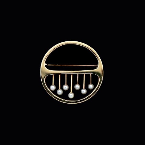 Bræmer-Jensen. Broche i 14k guld med perler. Tegnet og udført af Bræmer-Jensen - 1957 - 1991. Stemplet Br.J 585. Str. 49 mm. Diam. 3,5 cm. Vægt 6,9 g. Brugt i god stand.