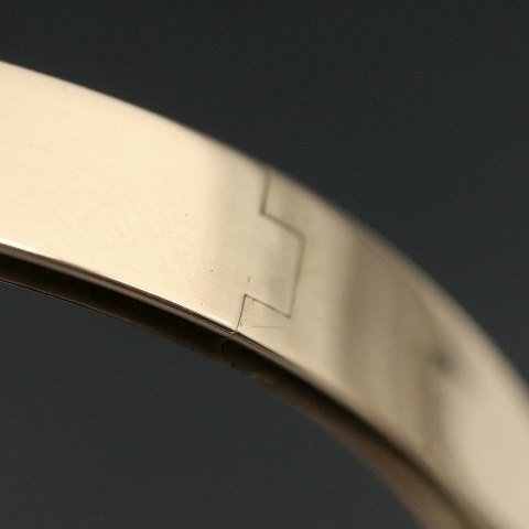 Jos. Kahn - KBH. Hænglset armring i 14k guld. Tegnet og udført af Jos. Kahn - Copenhagen 1957 - 1990. Stemplet Jo.K. 585. Indre dia. 6,2 x 5,5 cm. Bredde 0,8 cm. Vægt 20 g. Brugt i god stand.